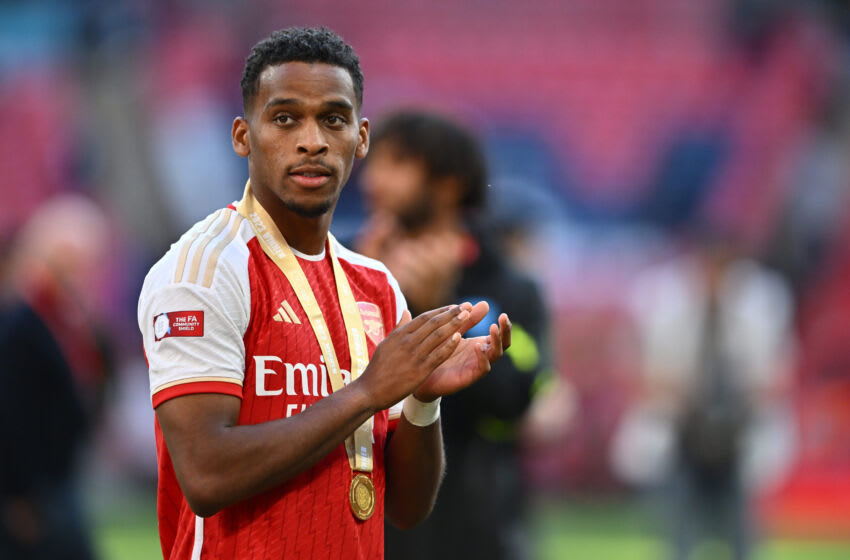 LONDON, ENGLAND - AUGUST 6: Jurrien Timber of Arsenal celebrates following their sides victory after The FA Community Shield match between Manchester City against Arsenal at Wembley Stadium on August 6, 2023 in London, England. (Photo by Sebastian Frej/MB Media/Getty Images)