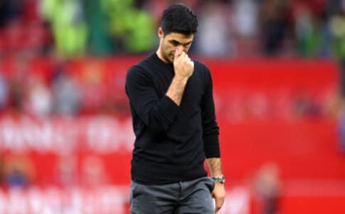 MANCHESTER, ENGLAND – SEPTEMBER 04: Mikel Arteta, Manager of Arsenal looks dejected after the Premier League match between Manchester United and Arsenal FC at Old Trafford on September 04, 2022, in Manchester, England. (Photo by Michael Regan/Getty Images)