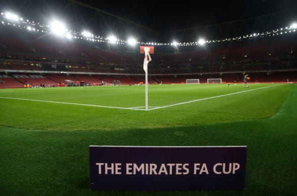 LONDON, ENGLAND – JANUARY 06: An Emirates FA Cup board is displayed pitch-side prior to the FA Cup Third Round match between Arsenal FC and Leeds United at the Emirates Stadium on January 06, 2020 in London, England. (Photo by Julian Finney/Getty Images)