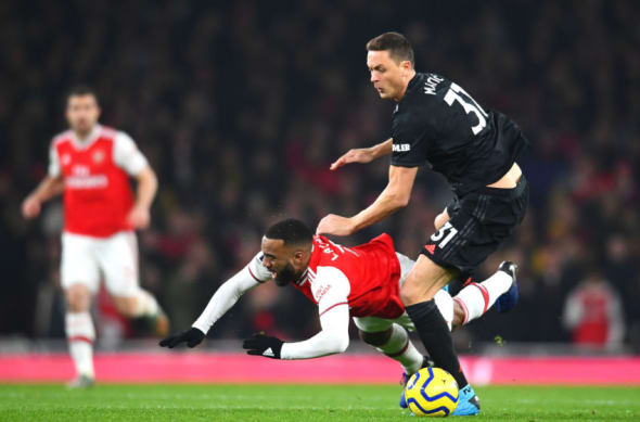 LONDON, ENGLAND – JANUARY 01: Alexandre Lacazette of Arsenal is fouled by Nemanja Matic of Manchester United during the Premier League match between Arsenal FC and Manchester United at Emirates Stadium on January 01, 2020 in London, United Kingdom. (Photo by Clive Mason/Getty Images)