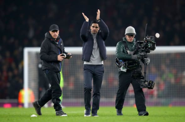 LONDON, ENGLAND – JANUARY 01: Mikel Arteta, Manager of Arsenal acknowledges the fans after the Premier League match between Arsenal FC and Manchester United at Emirates Stadium on January 01, 2020 in London, United Kingdom. (Photo by Julian Finney/Getty Images)