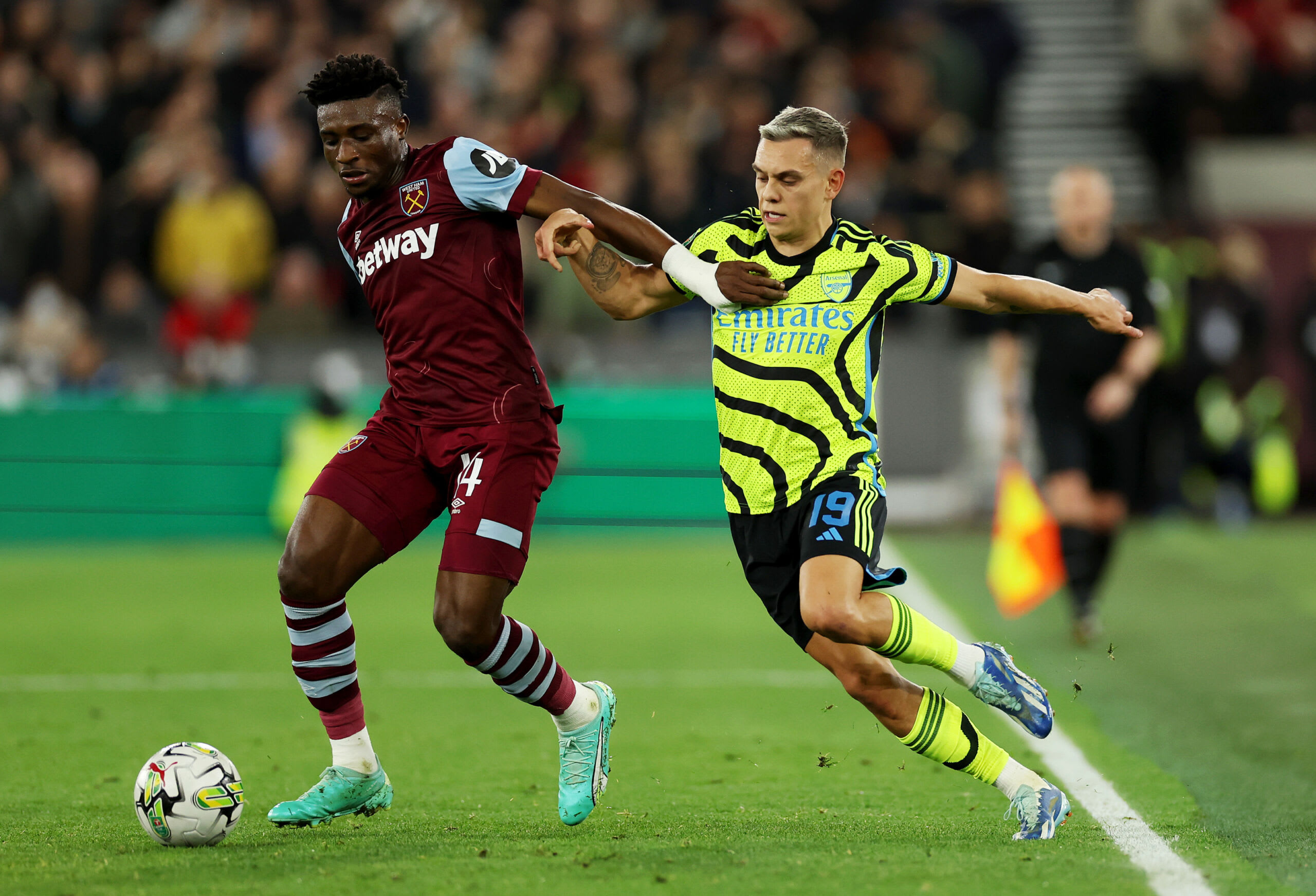 Arsenal's Brazilian defender #06 Gabriel Magalhaes (R) reacts after a shot from West Ham United's Ghanaian midfielder #14 Mohammad Kudas goes through his legs and into the net for the second goal during the English League Cup fourth round football match between West Ham United and Arsenal at The London Stadium, in east London, on November 1, 2023. (Photo by HENRY NICHOLLS / AFP) / RESTRICTED TO EDITORIAL USE. No use with unauthorized audio, video, data, fixture lists, club/league logos or 'live' services. Online in-match use limited to 120 images. An additional 40 images may be used in extra time. No video emulation. Social media in-match use limited to 120 images. An additional 40 images may be used in extra time. No use in betting publications, games or single club/league/player publications. / (Photo by HENRY NICHOLLS/AFP via Getty Images)