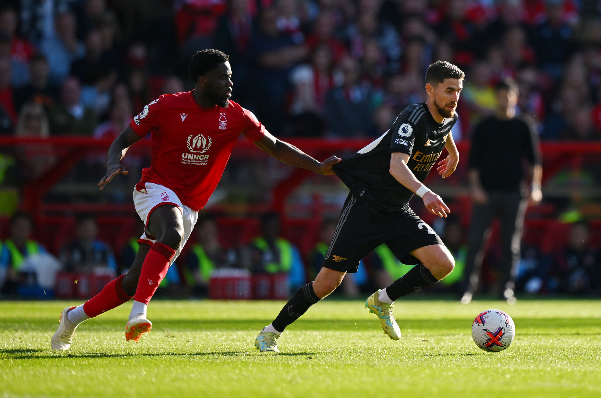 NOTTINGHAM, ENGLAND – MAY 20: Orel Mangala of Nottingham Forest battles for possession with Jorginho of Arsenal during the Premier League match between Nottingham Forest and Arsenal FC at City Ground on May 20, 2023 in Nottingham, England. (Photo by Clive Mason/Getty Images)
