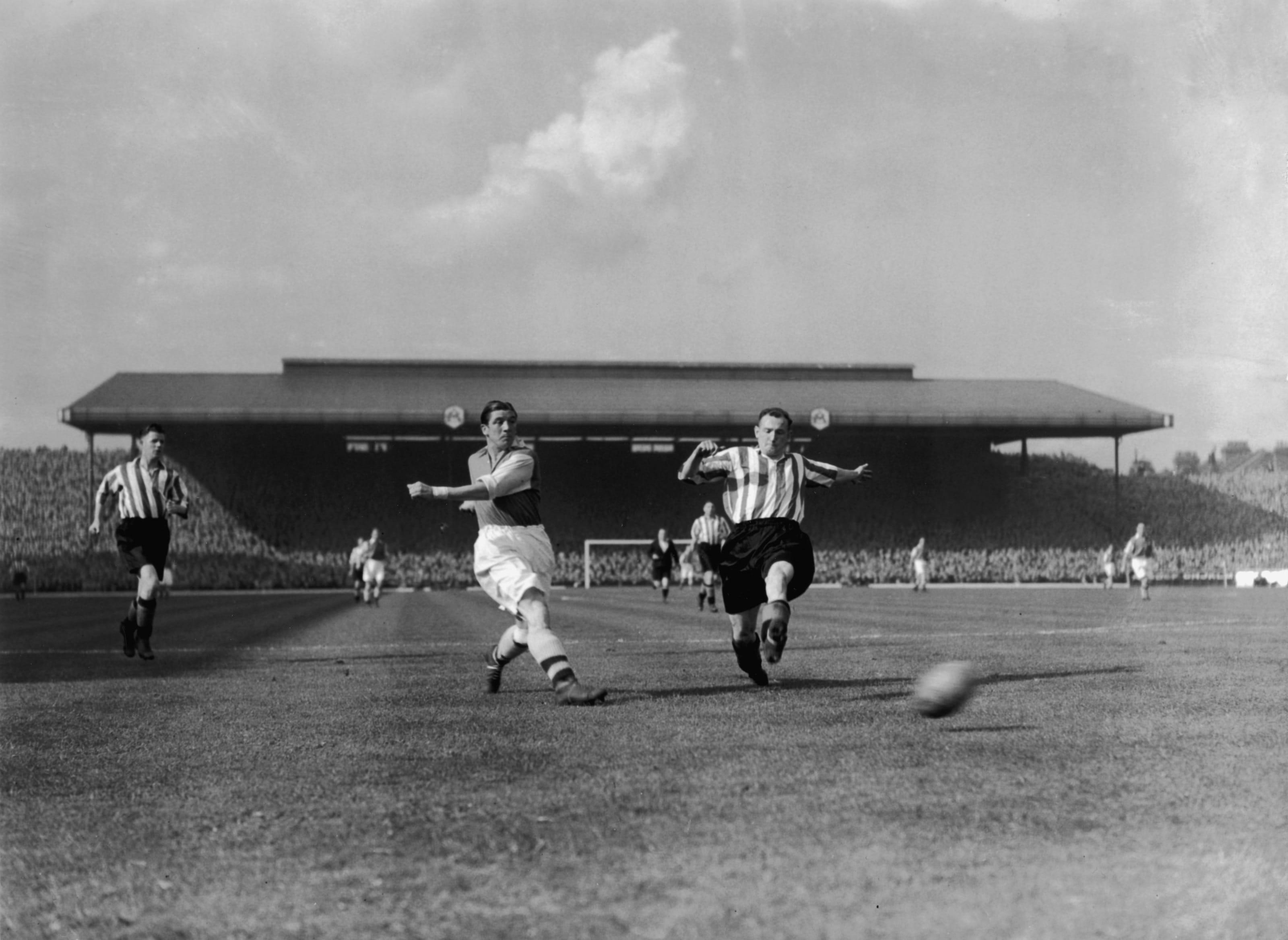 Arsenal forward Ted Drake (centre) takes a shot at goal during a match against Sunderland at Highbury, 18th September 1937. (Photo by Fox Photos/Hulton Archive/Getty Images)