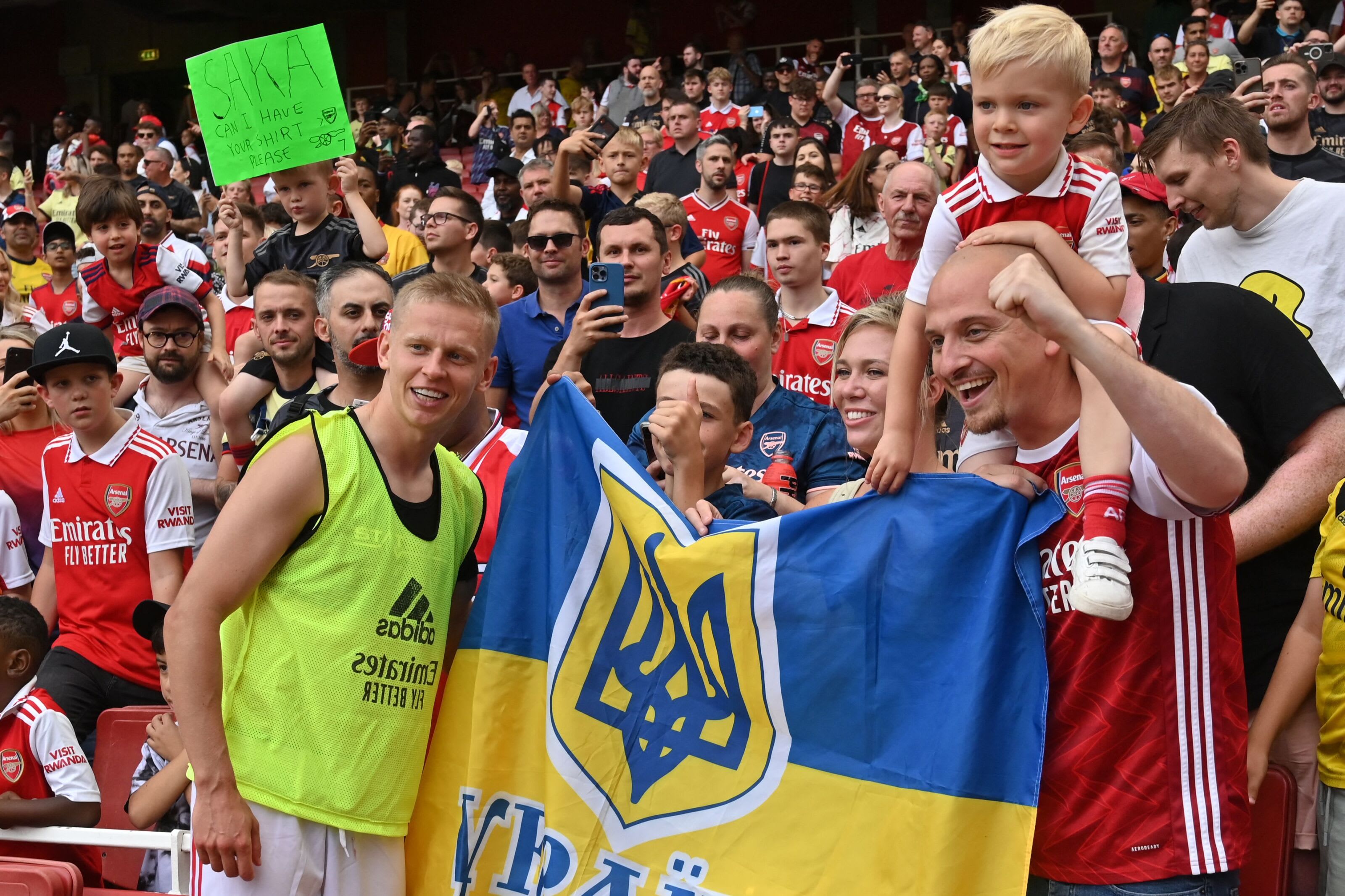 Arsenal’s Ukrainian defender Oleksandr Zinchenko poses for a photo with fans holding a Ukrainian flag at the end of a club friendly football match between Arsenal and Sevilla at the Emirates Stadium in London on July 30, 2022. (Photo by JUSTIN TALLIS / AFP) (Photo by JUSTIN TALLIS/AFP via Getty Images)