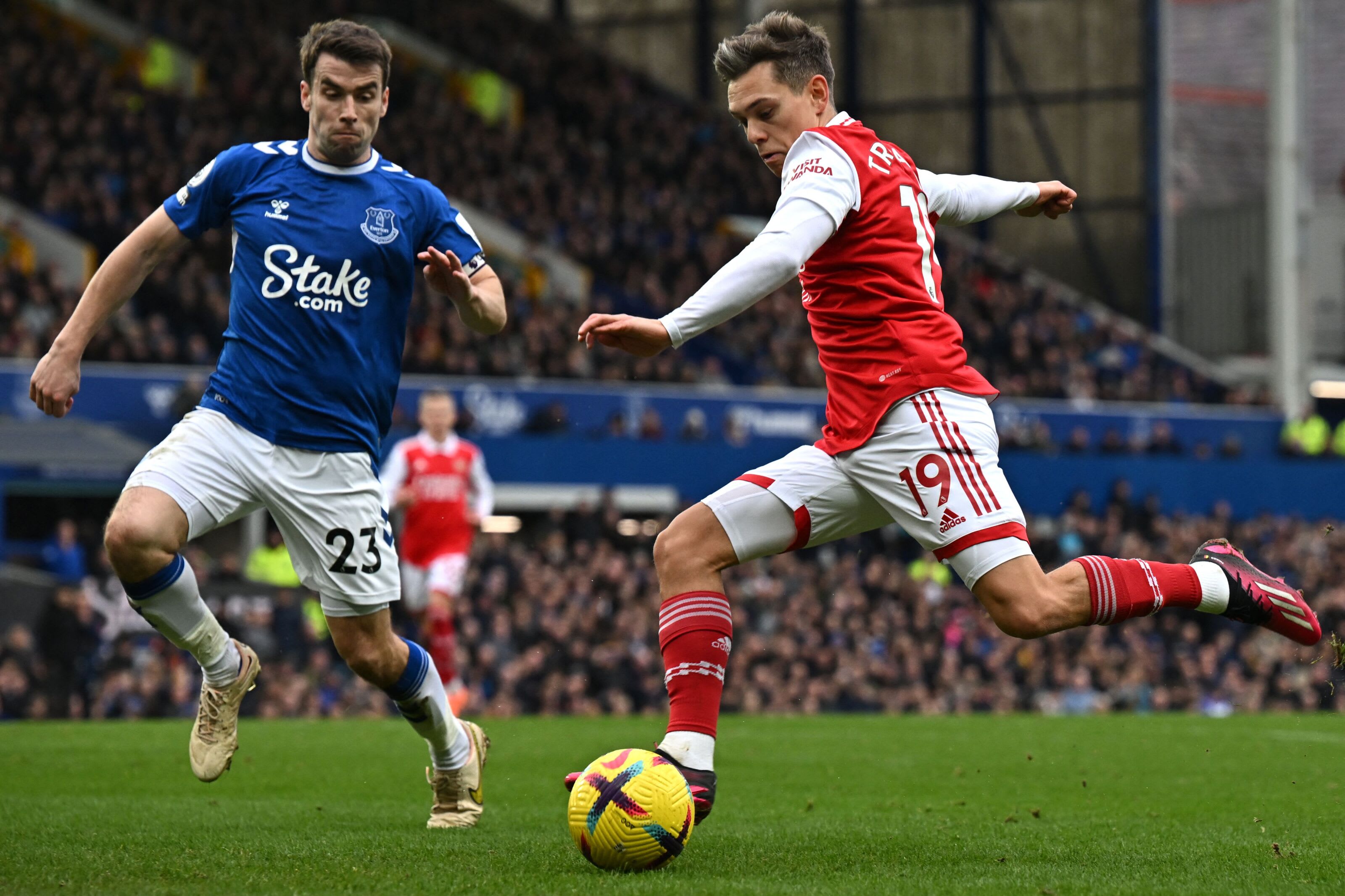 Arsenal’s Belgian midfielder Leandro Trossard (R) challenges Everton’s Irish defender Seamus Coleman during the English Premier League football match between Everton and Arsenal at Goodison Park in Liverpool, north-west England, on February 4, 2023. – RESTRICTED TO EDITORIAL USE. No use with unauthorized audio, video, data, fixture lists, club/league logos or ‘live’ services. Online in-match use limited to 120 images. An additional 40 images may be used in extra time. No video emulation. Social media in-match use limited to 120 images. An additional 40 images may be used in extra time. No use in betting publications, games or single club/league/player publications. (Photo by Paul ELLIS / AFP) / RESTRICTED TO EDITORIAL USE. No use with unauthorized audio, video, data, fixture lists, club/league logos or ‘live’ services. Online in-match use limited to 120 images. An additional 40 images may be used in extra time. No video emulation. Social media in-match use limited to 120 images. An additional 40 images may be used in extra time. No use in betting publications, games or single club/league/player publications. / RESTRICTED TO EDITORIAL USE. No use with unauthorized audio, video, data, fixture lists, club/league logos or ‘live’ services. Online in-match use limited to 120 images. An additional 40 images may be used in extra time. No video emulation. Social media in-match use limited to 120 images. An additional 40 images may be used in extra time. No use in betting publications, games or single club/league/player publications. (Photo by PAUL ELLIS/AFP via Getty Images)