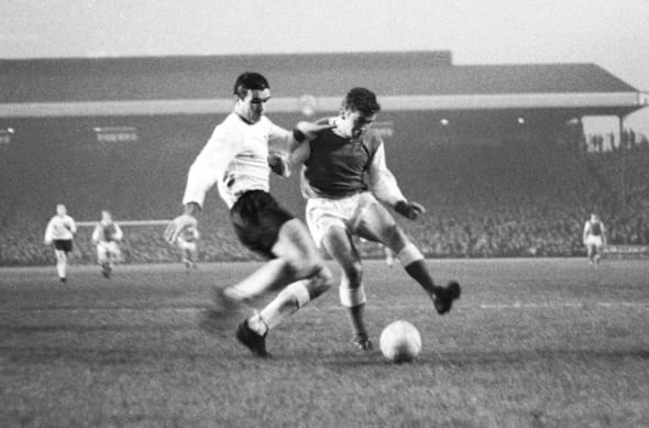 (L-R) Liverpool’s Ron Yeats tackles Arsenal’s Joe Baker (Photo by S