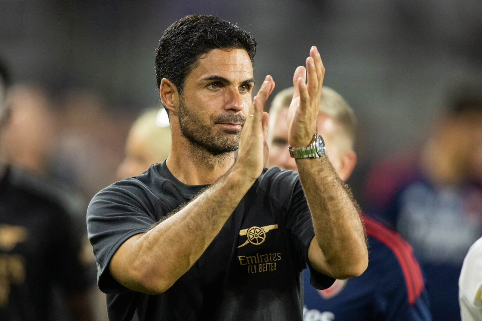 ORLANDO, FL – JULY 20: Mikel Arteta of Arsenal applauds the fans during a game between Arsenal FC and Orlando City at Exploria Stadium on July 20, 2022, in Orlando, Florida. (Photo by Trevor Ruszkowski/ISI Photos/Getty Images)